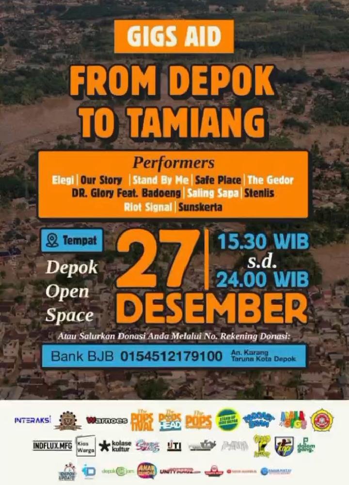 Info Event Gigs Aid – From Depok To Tamiang Redaksi UnityMagz Desember 26, 2025 0 Bagikan ini: Klik untuk membagikan di Facebook(Membuka di jendela yang baru) Facebook Klik untuk berbagi di X(Membuka di jendela yang baru) X Menyukai ini:Suka Memuat... Post navigation Previous: Kemirimuka Festival – Satu Hati Tiga AksiNext: ES CORET Rayakan 27 Tahun Berkarya Lewat Album “Berdansa di Keramaian Kota” More Stories Info Event Motovillage Road to IIMS Redaksi UnityMagz Februari 11, 2026 0 Info Event Parade Seni Budaya – Hut Kota Tangerang ke – 33 Redaksi UnityMagz Februari 11, 2026 0 Info Event Charity For Indonesia – Orijingan Indonesia Peduli Redaksi UnityMagz Februari 11, 2026 0 Tinggalkan Balasan Batalkan balasanAlamat email Anda tidak akan dipublikasikan. Ruas yang wajib ditandai *Komentar * Nama * Email * Situs Web Simpan nama, email, dan situs web saya pada peramban ini untuk komentar saya berikutnya. Δ