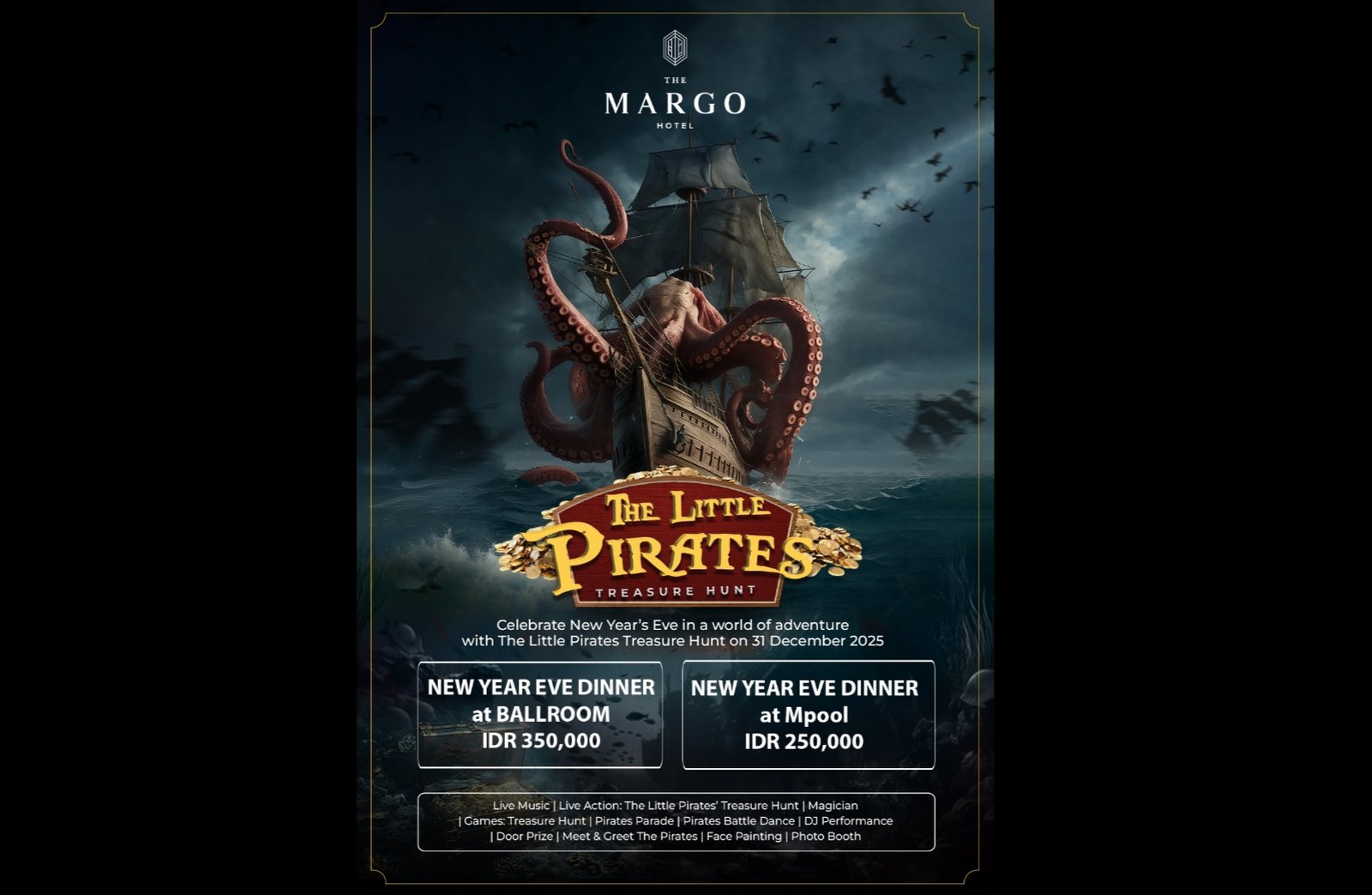 unitymagz.com – The Margo Hotel menghadirkan perayaan malam pergantian tahun bertema keluarga bertajuk “The Little Pirates Treasure Hunt” untuk menyambut Tahun Baru 2026. Acara yang digelar pada 31 Desember 2025 ini mengajak para tamu, khususnya anak-anak dan keluarga, menikmati pengalaman petualangan bajak laut yang interaktif, edukatif, dan penuh hiburan.